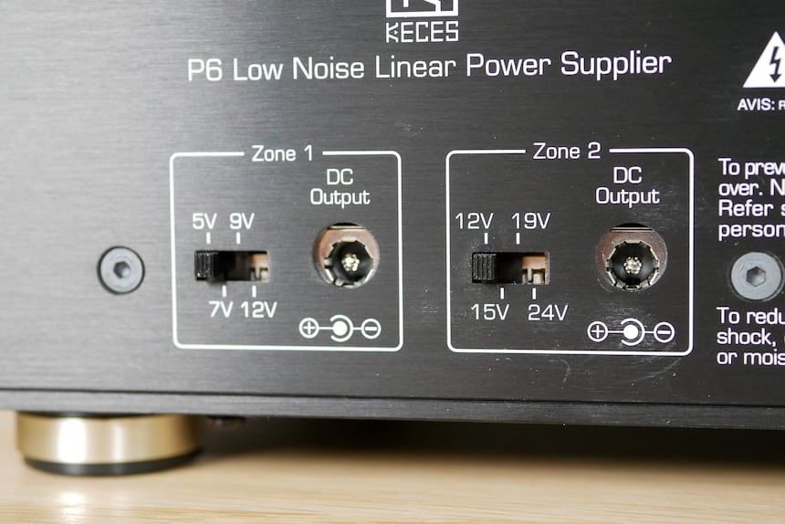 The power input is a 12-volt socket. Keces supplies a specific cable to connect this input to the appropriate output on the separate P6 power supply; it’s linear and very quiet. It is based on a custom-built toroidal transformer and an integral discrete component design. It also benefits from protection against overheating, overvoltage and undervoltage. Shielded, the P6 power supply eliminates the risk of both electromagnetic interference and radio frequency interference. The two DC outputs are configurable. It can therefore supply two different devices with different voltages, 5 to 12 volts or 12 to 24 volts.